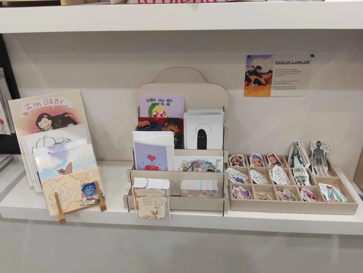 A shelf of my art for sale at Makers Market on Dundas Street W in Toronto.